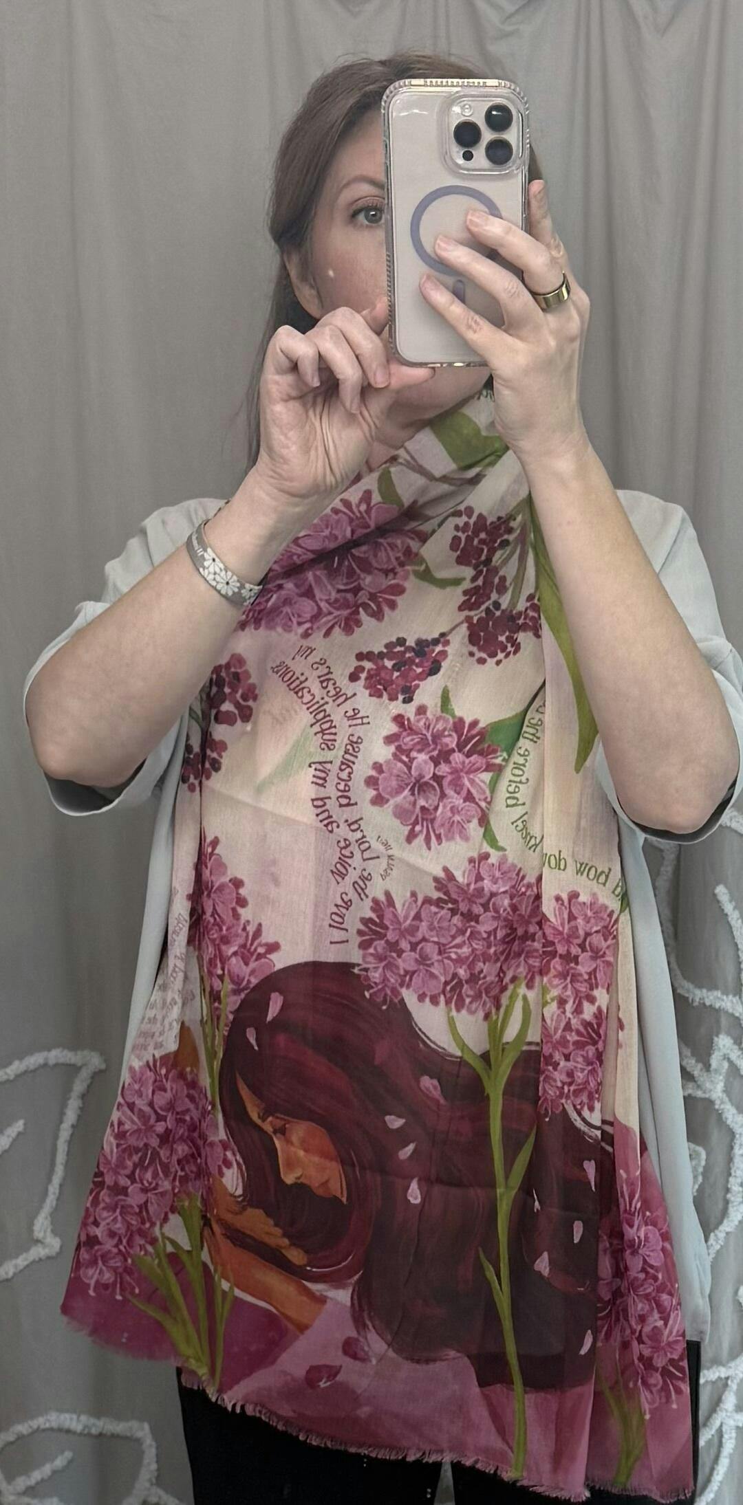 This vibrant scarf, with fuchsia, light green, and plum hues, is a celebration of the colorful, blossoming beauty of an unfolding, loving revelation of Christ. It's a wearable testament to the overwhelming sense of adoration and gratitude one can feel toward our Savior, encapsulating the essence of worship that is personal, profound, and productive.