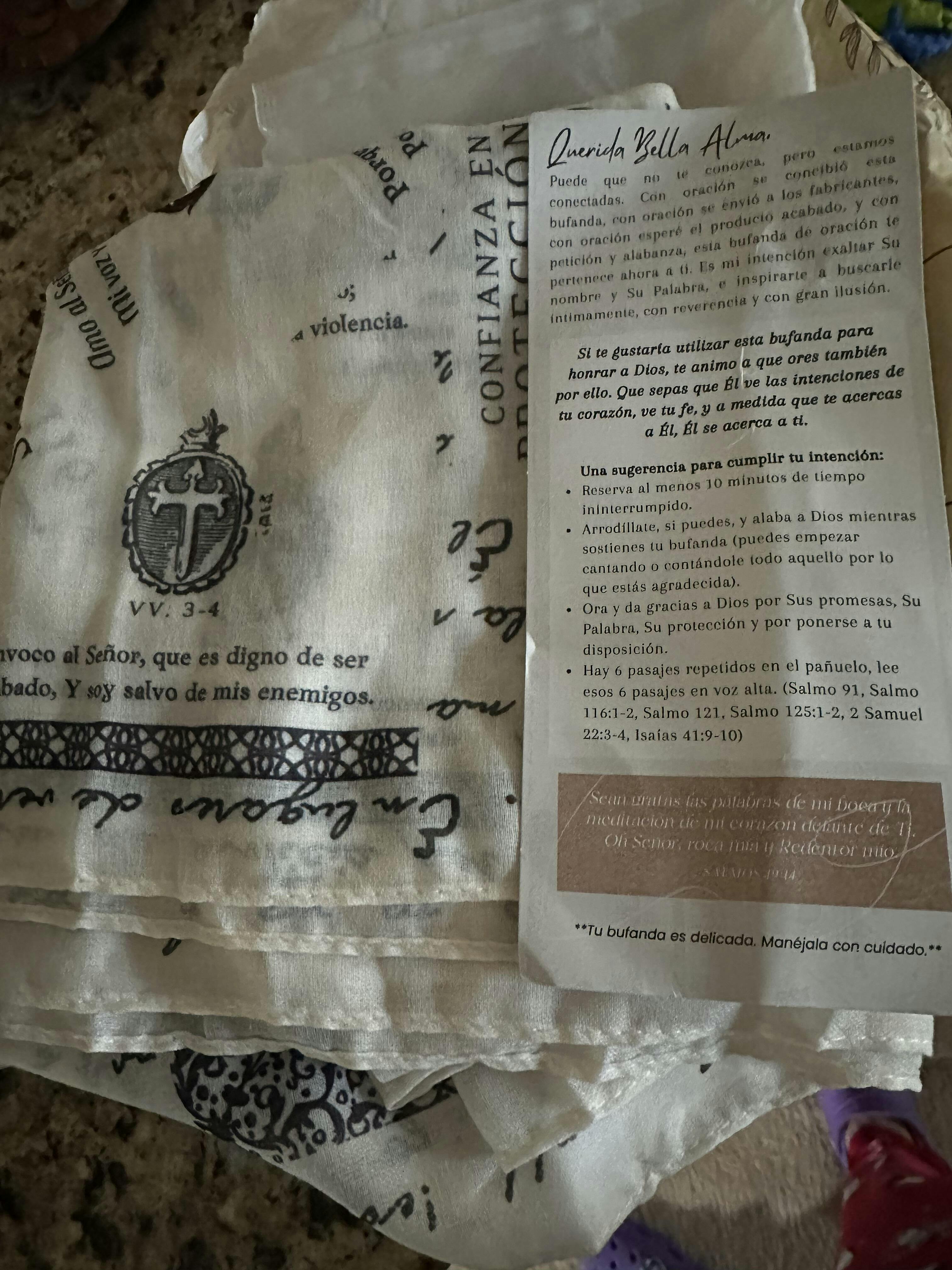 Este pañuelo fue diseñado con la intención de animarte, afirmar tu fe y representar una creencia compartida en las promesas que Dios nos da de protección en todas las estaciones de la vida. Es para esos momentos en los que tú o un ser querido necesitan un recordatorio tangible de estas verdades para aferrarse a ellas.